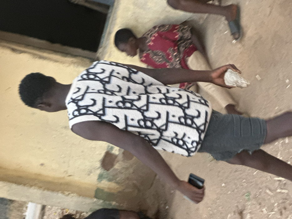 A young person with short dark hair is seen holding a cell phone in one hand and a rock in the other. They are wearing a white shirt with a black design and grey shorts. In the background, another child sits wearing a red and patterned shirt with light-colored pants. A portion of what appears to be a building is also visible in the background. The photo is shot at an angle.