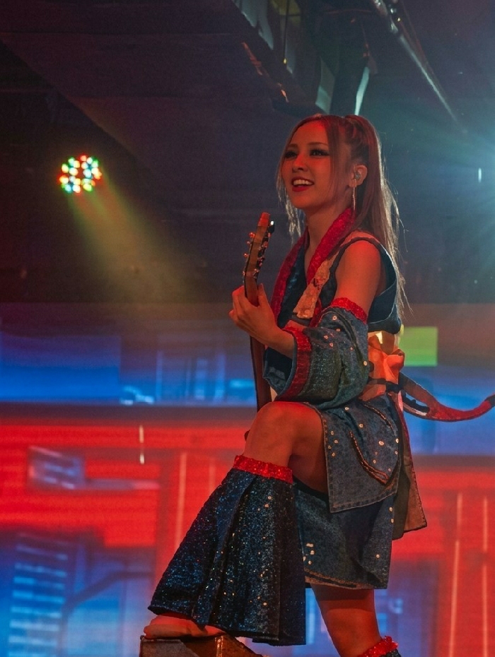 The image captures a female performer on a stage located in Shinjuku, Japan