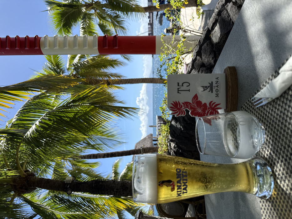 The image presents an outdoor dining table setting overlooking a tropical coastal environment. In the foreground, a tall glass of "HINANO TAHITI" beer with a foamy head is positioned on the left side of a dark patterned placemat. To its right, a shorter, stemless glass contains clear water. A white napkin partially obscures a silver fork to the right of the water glass. A white table sign, adorned with red floral patterns, displays "T5" at the top and "LE MOANA RESTAURANT" with a canoe logo at the bottom, standing on a wooden base. The table surface is light grey. The midground features dark, textured rock landscaping separating the dining area from the water. Numerous lush green palm trees with visible trunks and fronds dominate the upper and central portions of the frame, indicating a sunny, outdoor setting. Beyond the rock wall, a thatched-roof bungalow is visible over blue water, connected by a wooden pier. The ocean extends to the horizon, with distant landmasses and mountains visible under a clear blue sky with scattered white clouds. On the right side, a tall, vertical red and white striped pole, featuring horizontal slats or vents, stands near the water's edge. Hints of a dock or pier with moored boats are discernible further right. This scene is located at Le Moana Restaurant, part of the Hilton Hotel Tahiti in Papeete, France.
