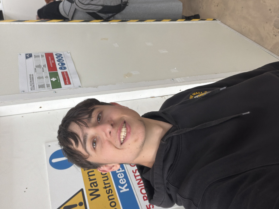 A young male, appearing to be in his late teens or early twenties with short dark hair, is positioned centrally in the foreground, smiling directly at the viewer. He wears a black hooded sweatshirt featuring a yellow circular 'Vans The Wall' logo on the right chest. The scene is located within the city of Uttlesford, United Kingdom. To the male's left, a white wall or temporary partition displays a yellow triangular 'Warning Construction' sign, partially reading 'Warning Construction Keep 5 Points', and a blue circular mandatory information sign. To his right, another light-colored panel is affixed with a comprehensive safety information sign. This sign includes a 'UAL' logo and details concerning an 'AIDC - EN 7th floor switch room' and 'To B. West OEC & Decon rooms,' along with risk assessment headers, 'First Aid,' 'PPE Required to Enter,' and 'AUTHORISED PERSONS ONLY' sections with symbols indicating mandatory ear protection, eye protection, and helmet use. Partially visible in the background, to the far right, is another individual seen from the back, wearing a long grey coat and a grey backpack with black straps. A yellow and black striped safety warning tape is visible on a vertical edge behind this individual. The floor appears to be concrete. The environment suggests an indoor construction site or a restricted technical area within a building.