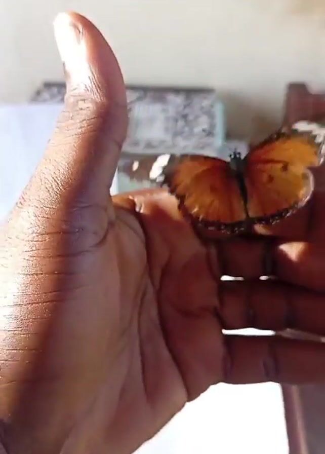 A person holds their left hand up, palm up, revealing an orange butterfly perched on it. The butterfly is primarily orange with dark brown markings and white spots along the edges of its wings. The person's hand is dark-skinned and appears to be held steady to allow the butterfly to rest. In the background, there is a white surface and some objects that appear to be books or documents. The lighting suggests the scene is well-lit.