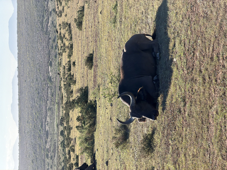 The image depicts a rural, open-field environment within Hessequa Nu, South Africa, under clear daylight conditions. In the foreground, a large, dark-brown African buffalo with prominent curved horns is lying down on dry, sparse grass and soil, facing left. Its eyes appear closed or partially closed, suggesting a state of rest. A partial view of a second buffalo, also lying down, is visible on the far left edge of the frame. The mid-ground features a vast expanse of light-brown and green scrubland interspersed with low-lying bushes and patches of dry grass. Several smaller, dark shapes, consistent with additional buffalo, are discernible in the mid-distance amongst the vegetation. A tall, thin utility pole stands vertically in the left-center mid-ground. The background reveals a distant, hazy blue mountain range beneath a bright sky. Sunlight illuminates the scene from an angle, casting short shadows to the right of objects. No human presence or direct interactions are visible.
