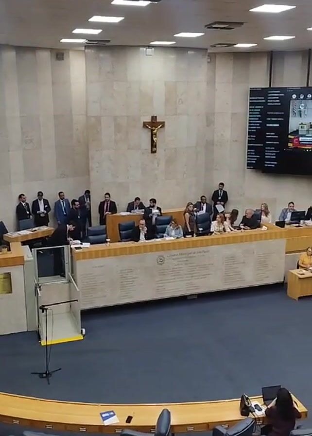 interior of the municipal chamber of São Paulo. Several people, mostly dressed in suits, are seated at desks arranged in a semi-circular format. A large screen displays a list of names along with video footage of someone speaking. A golden cross is mounted on the wall above the desks. In the foreground, a partially visible semi-circular seating area is empty. The room has a modern aesthetic with light-colored stone walls and recessed ceiling lights. A small lift is visible near the front of the room. Some of the people are conversing, while others appear to be listening or preparing to speak.