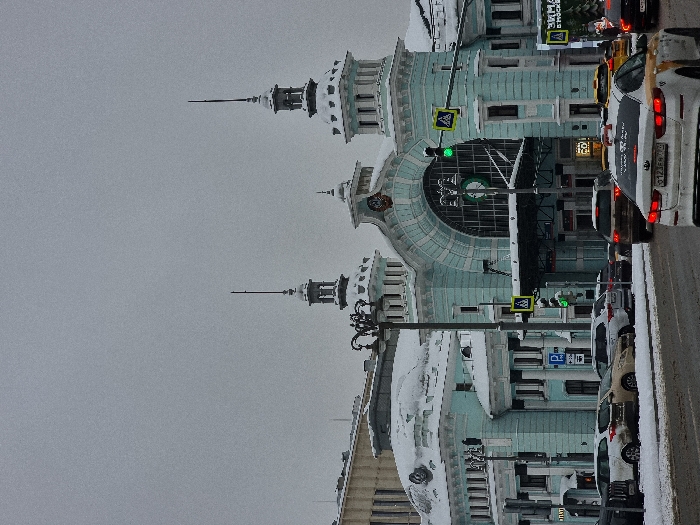 An urban scene shows a building with a pale blue facade and ornate architectural details, including spires. The sky is overcast. A street runs adjacent to the building, filled with a line of cars. A traffic light is visible, along with pedestrian crossing signs. The architecture suggests a historical building, possibly in Europe.