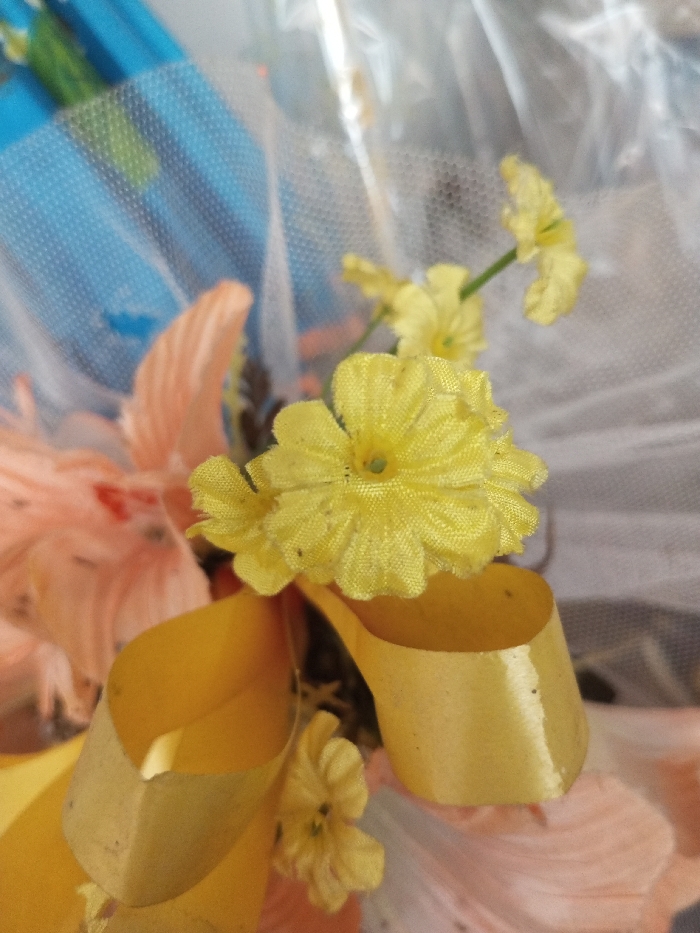 A vibrant display of artificial flowers and ribbons fills the frame. Predominantly, yellow blossoms with textured petals take center stage. Accompanying these are peach-colored floral elements that appear soft and feathered. Shiny yellow ribbons curl gracefully among the blooms, adding a touch of elegance. The arrangement is partially encased in a sheer, white netting material, hinting at a bouquet or decorative piece. Blue and white colors are subtly visible in the background.