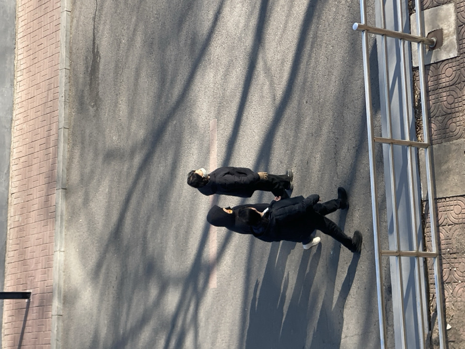 An aerial shot captures two individuals walking on a grey asphalt surface. Both are dressed in dark clothing, casting long shadows that stretch across the road. One person appears to be slightly ahead of the other. A section of brick pavement is visible on the left, while a metal railing runs along the right edge of the image. Sunlight filters through, creating a pattern of shadows and highlights on the ground.