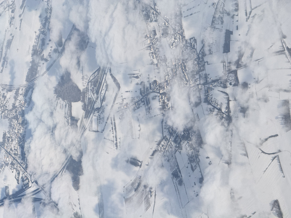 - "An aerial, high-altitude photograph depicts a snow-covered winter landscape, identified as Moreira, Portugal, partially obscured by scattered white clouds and fog" by FM-euyLP2, licensed under CC BY 4.0