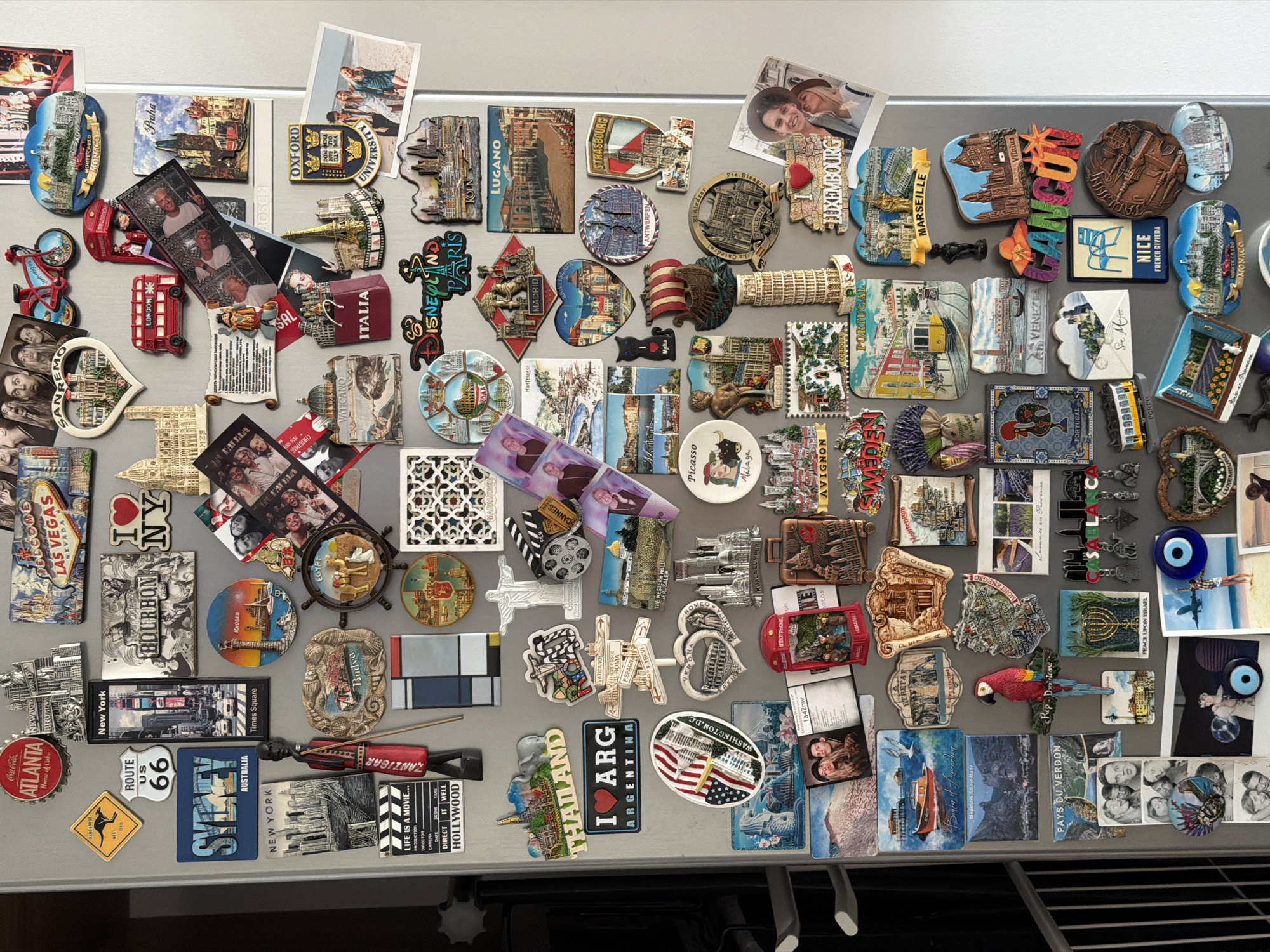 This image is a close-up of a refrigerator door completely covered with souvenir magnets and photographs
