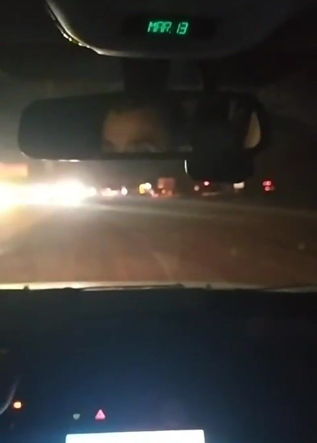 view from inside a car at night. The dashboard and rearview mirror are visible. Through the windshield, one can see headlights and taillights of other vehicles on a road, as well as some lights from nearby buildings. The dashboard display indicates it is March 13th. A person's face is visible in the rearview mirror. The car appears to be in motion.