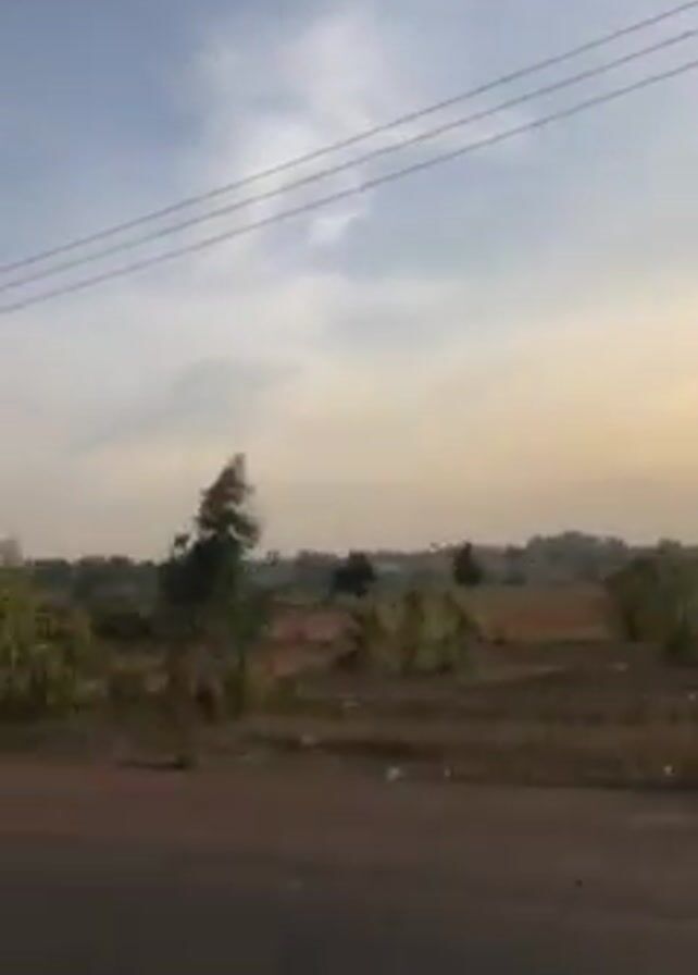 sunrise viewed from a moving vehicle on a road. The sun is low on the horizon and obscured by trees and utility poles. The landscape includes dry grass and scattered trees. The sky is a mix of blue and orange hues.