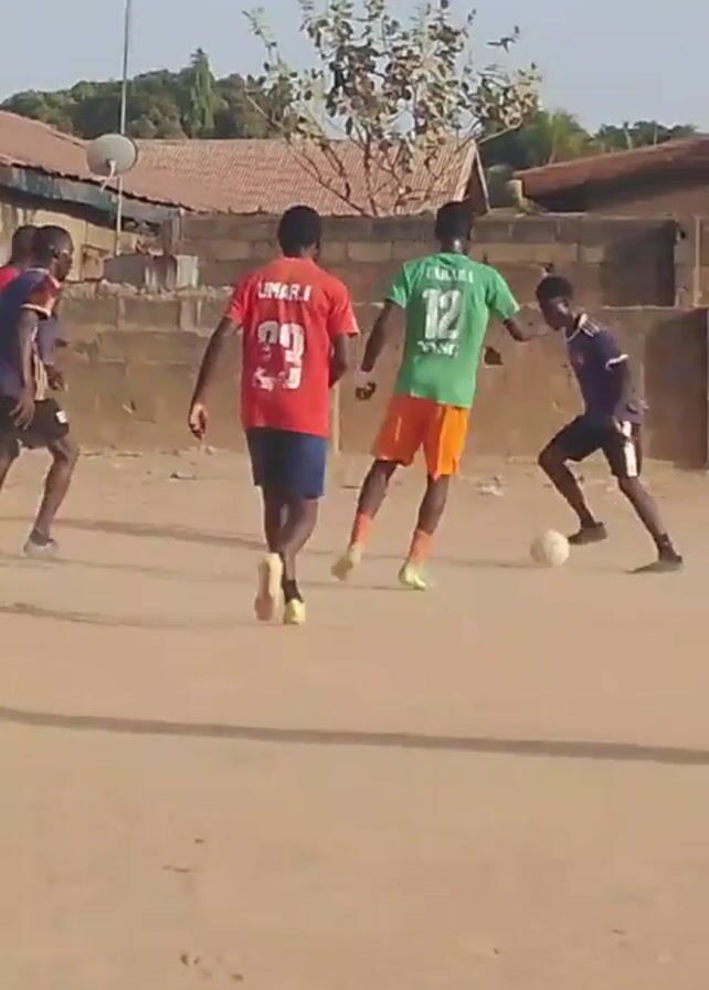group of young men playing soccer on a dirt field