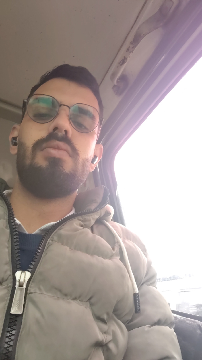 A male individual is depicted in a close-up, high-angle portrait, appearing to be seated inside a vehicle. He possesses dark hair, a short beard, and a mustache. He wears round-framed glasses with dark frames and dark-colored wireless earbuds in both ears. His attire consists of a dark blue garment underneath a light beige or khaki-colored puffer jacket. The jacket features a black zipper with a silver-colored pull tab embossed with "SUCDI". A white drawstring with a dark plastic tip, possibly marked "SYLAD", is visible on the right side of his jacket, suggesting a hood. The immediate background shows a white ceiling with visible staining and a grab handle. To the subject's right, an overexposed window reveals an indistinct, brightly lit outdoor environment, with faint suggestions of distant structures or foliage. The specific location within Al-Qaboun Municipality, Syria, is not visually identifiable from the image content.