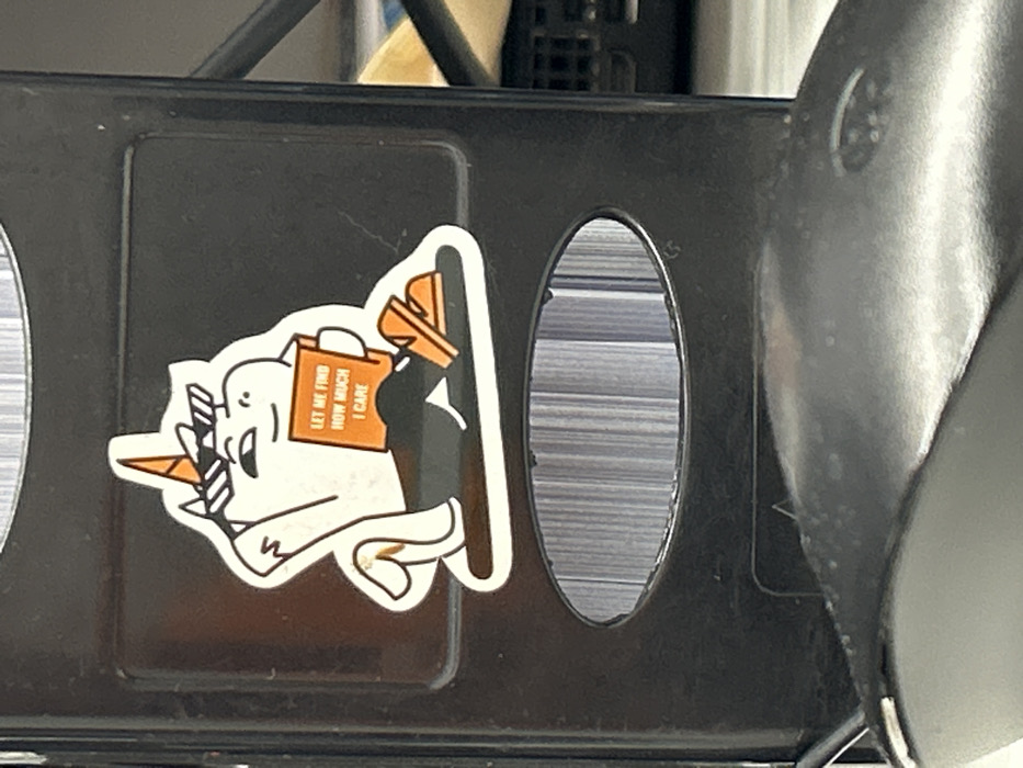 The image displays a close-up, waist-level view of a desk area. The primary subject is a sticker affixed to a vertical, dark grey or black rectangular object. The sticker depicts a cartoon unicorn character, outlined in white with black line details. The unicorn wears black sunglasses, has an orange horn with white stripes, and is shown in a relaxed, seated posture with legs extended, wearing orange sandals. It holds an open orange object, possibly a book or tablet, displaying the white capitalized text "LET ME FIND HOW MUCH I CARE." The object the sticker is attached to features a horizontal, oval-shaped cutout near its base, revealing vertically oriented, light grey or white parallel strips behind it, possibly paper stacks or internal components. The lower portion of a black computer mouse with a smooth, matte finish is visible in the immediate foreground, positioned below the dark object and partially obscuring it. The background is indistinct and dark, suggesting an indoor office or desk environment. No specific identifying features of Sofia, Bulgaria, or any precise location within the city are discernible from the visual evidence presented.