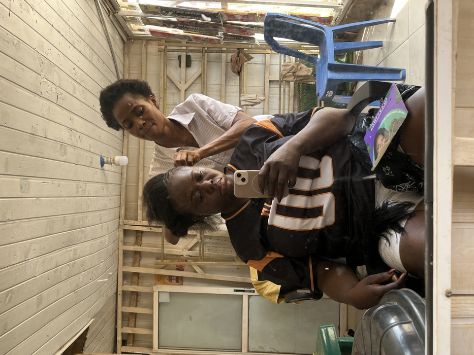 This image depicts a mirror selfie taken inside a hair braiding salon in Abuja, Nigeria