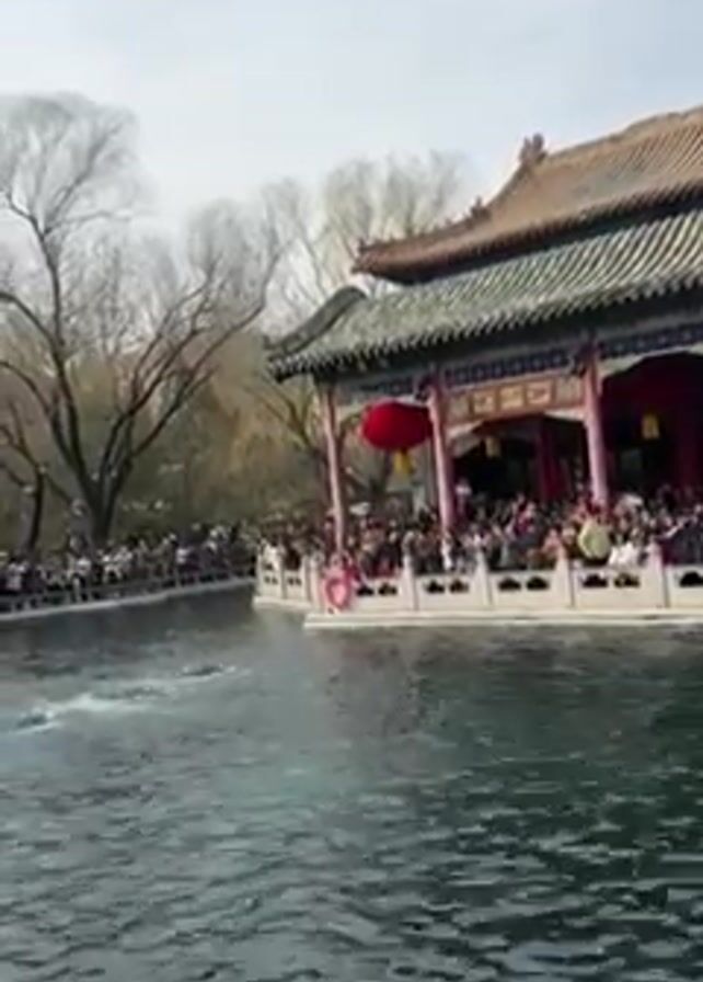 large group of people gathered around a pond-like body of water in front of a traditional Chinese building. The building has a tiled roof, red pillars, and what appears to be decorative paintwork on the eaves. A red lantern hangs inside the structure. People are standing both on the building's platform and on a pathway that runs alongside the water. The water is calm, and there are some slight ripples on its surface. The surrounding environment includes bare trees and an overcast sky. The scene appears to be a public gathering or event taking place in a park or garden-like setting.