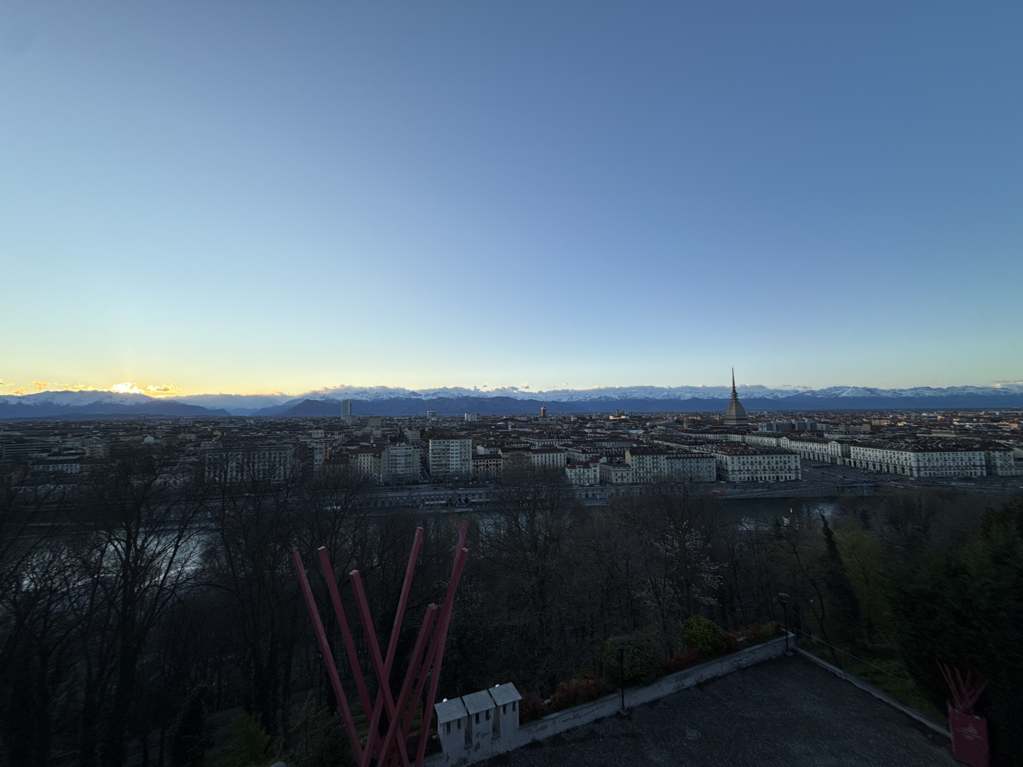 This panoramic photograph depicts the city of Turin, Italy, observed from an elevated vantage point, likely Monte dei Cappuccini. The scene is illuminated by the low sun, indicating either sunrise or sunset, with a clear sky transitioning from a yellow-orange glow on the western horizon to a light blue overhead. In the foreground, a dense, dark canopy of bare deciduous trees occupies the lower half of the image, suggesting winter or early spring. To the left, a prominent abstract sculpture consisting of multiple slender, red, vertical pillars angled upwards is visible. Adjacent to the sculpture, a light-colored, low-rise structure with three crenellated sections is situated behind a dark, paved surface and a low retaining wall, visible in the bottom right corner. The mid-ground showcases the urban sprawl of Turin. The Po River flows from left to right, reflecting the sky's light and traversed by multiple bridges. Densely packed residential and commercial buildings, predominantly light-colored with dark roofs, line the riverbanks and extend into the city. The iconic Mole Antonelliana, a tall, pointed spire, stands out prominently on the right side of the city horizon. In the background, a long range of snow-capped mountains, identified as the Alps, stretches across the entire horizon, partially obscured by a band of clouds illuminated by the low sun. No people or specific actions are discernible within the frame.