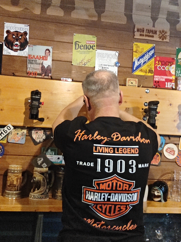 A man wearing a black Harley-Davidson t-shirt stands in front of a wooden wall decorated with various posters and objects. The t-shirt features the Harley-Davidson logo and the words "Living Legend" and "Trade 1903 Mark". Above the man, the wall is adorned with signs displaying Russian text, including beer labels. Beer taps are mounted on the wooden wall. The area beneath the taps and signs also contains beer steins, coasters, and other decorative items.