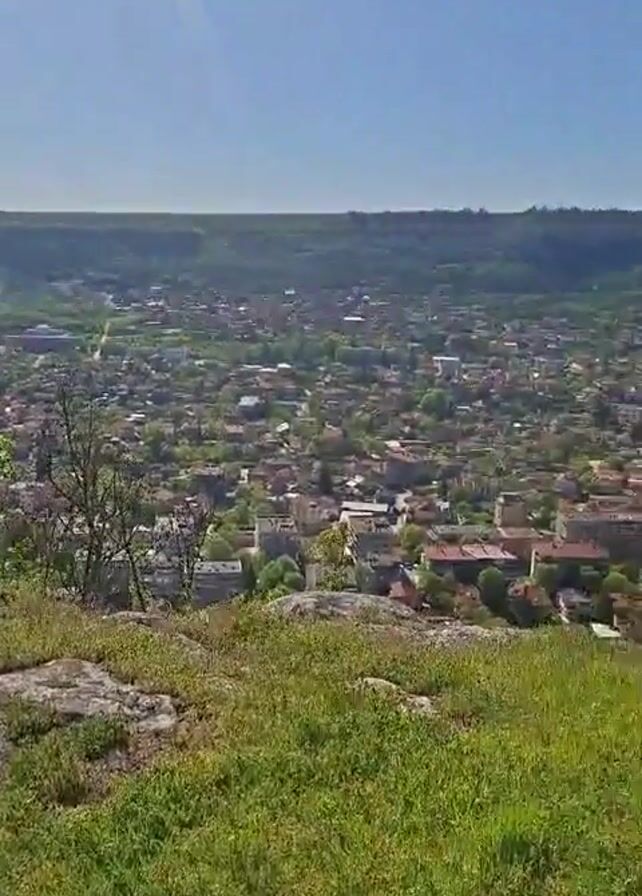 scenic view of a town from a high vantage point. The camera is positioned on a grassy hilltop, and in the foreground, there are patches of green grass, some low-lying plants, and a few rocks. In the distance, a densely packed town extends across the landscape. The buildings are mostly low to mid-rise, with a mix of residential and commercial structures. Beyond the town, a ridge of hills can be seen, providing a natural backdrop to the urban sprawl. The sky is a clear, bright blue.