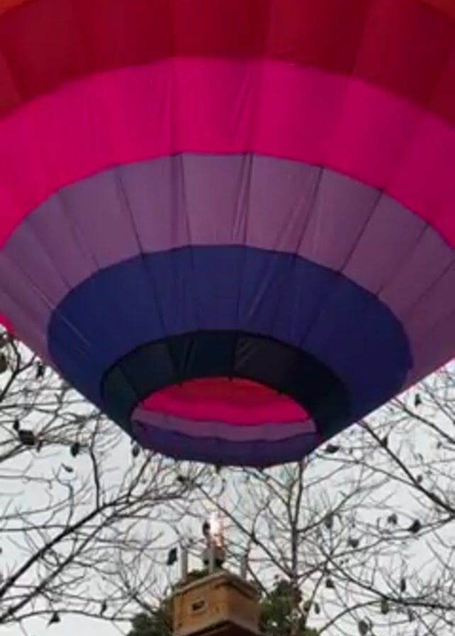 hot air balloon with a red, pink, lavender, and blue color scheme being filled with hot air from a flame underneath it. The balloon basket is visible and made of wood. The balloon is positioned against a grey sky, with bare tree branches visible in the foreground. Upbeat music is playing in the background.