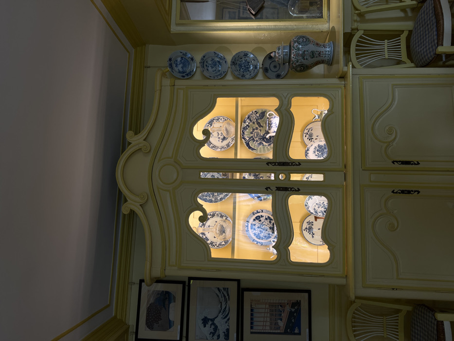This image depicts the brightly illuminated interior of the dining room at Claude Monet's house in Giverny, France. A large, ornate, light yellow wooden display cabinet, featuring Rococo-style curves and carved details, occupies the central and lower portions of the frame. The upper section of the cabinet has two glass-fronted doors, revealing multiple shelves filled with blue and white ceramic plates, bowls, and pitchers, all illuminated by an internal light source that casts a warm glow. The ceramics display various patterns, including floral and landscape motifs. The lower cabinet section consists of two solid, carved doors with dark handles. To the left of the cabinet, three framed Japanese woodblock prints are vertically mounted on the yellow wall; the middle print is distinctly "The Great Wave off Kanagawa" by Hokusai. To the right, a vertical stack of five blue and white decorative plates is hung on the wall, above a large blue and white ceramic ginger jar with a lid resting on a yellow surface. A rectangular mirror with a yellow frame is partially visible further to the right. The walls throughout the room are painted a vibrant yellow, and a yellow crown molding runs along the ceiling. Two yellow-painted wooden chairs with patterned blue and white fabric seats are partially visible in the lower left and right foreground, flanking the display cabinet. The room's overall ambient lighting is subdued, contrasting with the bright interior of the hutch.
