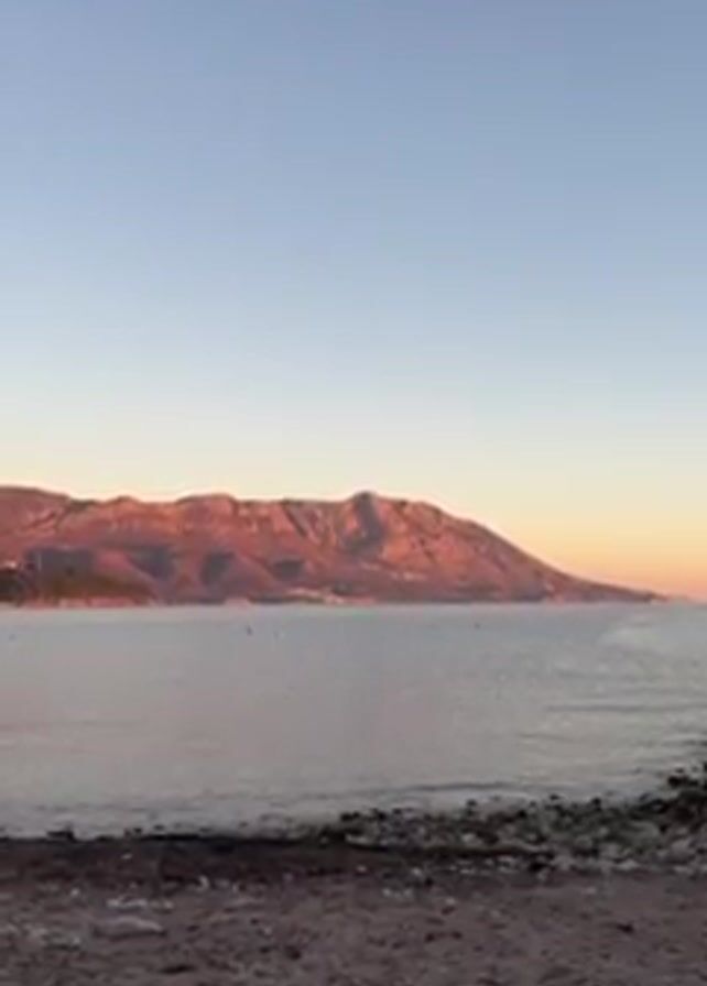 scenic view of a beach with a large mountain in the background, taken during what appears to be dawn or dusk. The sky is clear with soft, gradient colors of blue and peach/orange. The mountain range is bathed in a warm, reddish hue. The sea is calm with gentle ripples, reflecting the colors of the sky. In the distance, a sailboat is visible. The foreground shows a beach with a mix of sand and pebbles. The lighting suggests a peaceful, serene atmosphere. There are also the sounds of people talking in the background.