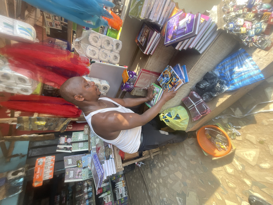 - "An adult male, bald with dark skin and a sheen of perspiration, wearing a white sleeveless undershirt and dark trousers, stands behind a market stall in Umunekwu, Nigeria" by FM-aUL5t2, licensed under CC BY 4.0