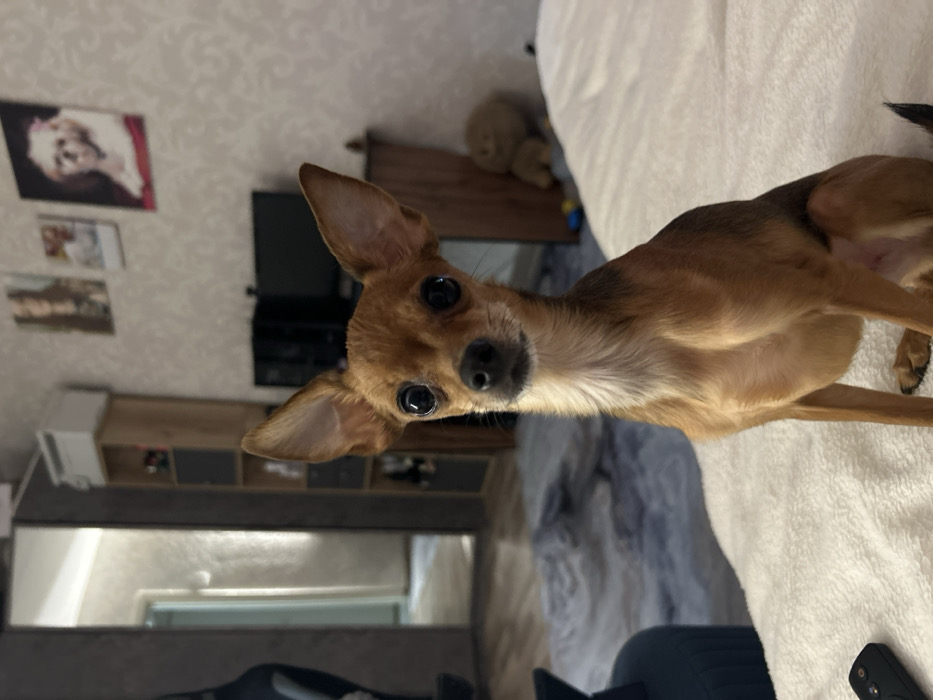 - "A small, brown chihuahua stands on a white, textured bedspread, looking directly at the camera" by FM-5FD7E2, licensed under CC BY 4.0
