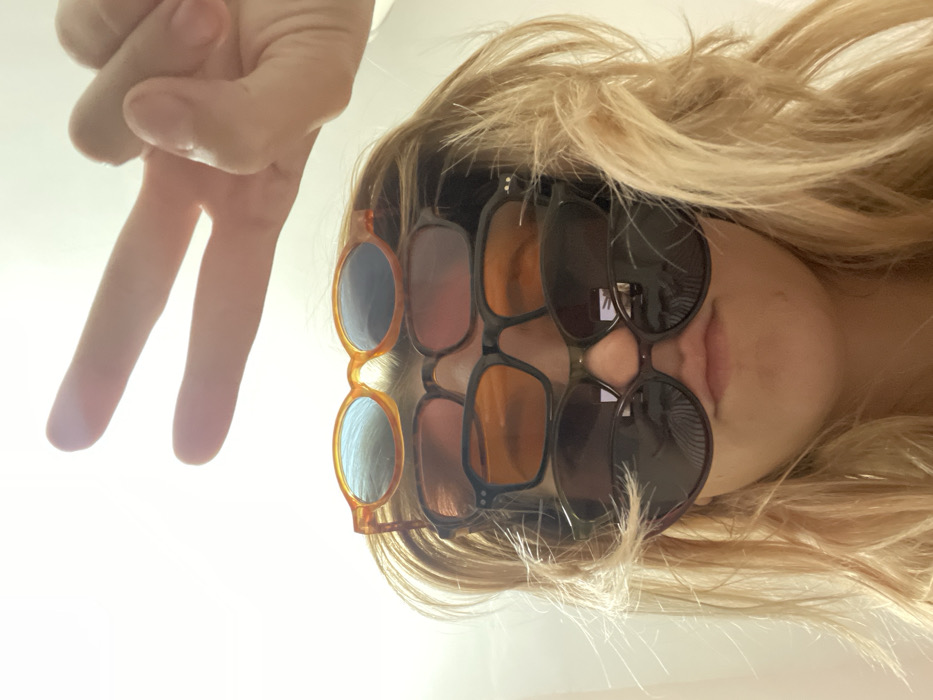 A single individual, a person with blonde hair, is depicted from the mid-forehead to the upper chest, their face largely obscured by five vertically stacked pairs of sunglasses