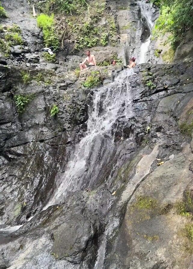 The video depicts a multi-tiered waterfall in a lush, green environment. Three individuals are positioned on the rocks at different levels of the waterfall. The water cascades down the rocky terrain, creating a small pool at the base. The surrounding area is filled with vegetation, adding to the natural setting.