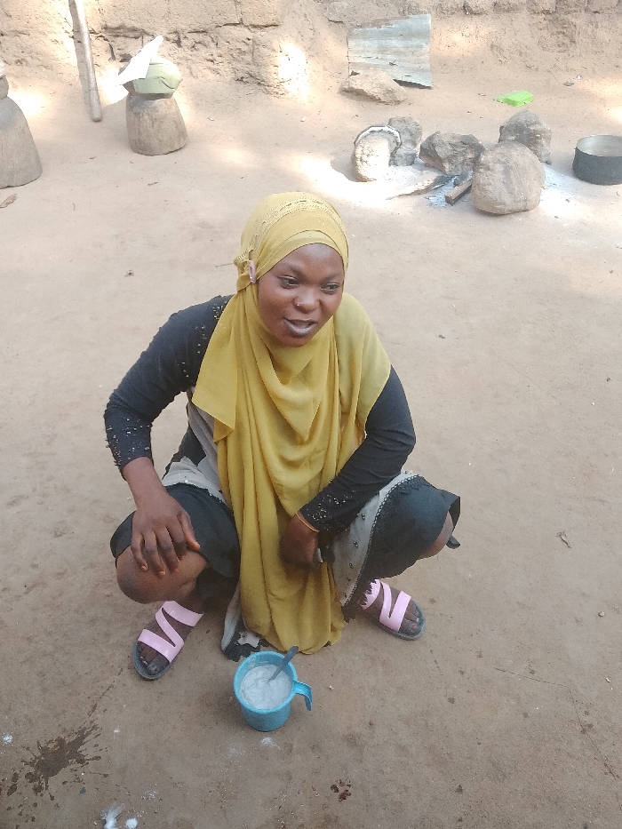 In Andaha, Nigeria, a single adult female is depicted crouching on sandy ground. She is oriented slightly to the left of the frame, with her head turned slightly right, and her mouth partially open, suggesting speech or a smile. She wears a golden yellow hijab covering her head and chest, a long-sleeved black top with beaded embellishments on the sleeves, and a grey and black patterned skirt or lower garment. On her feet are light pink flat sandals. A small silver-colored earring is visible on her left ear. Directly in front of her, on the ground, rests a light blue plastic mug containing a white, semi-liquid substance and a silver spoon. To the immediate left of the mug, dark brown liquid splatters are visible on the ground, along with several small white granular specks. The background consists of a textured earthen wall structure. To the far left, a tall, dark wooden cylindrical object, possibly a mortar or stool, supports a green, rounded pot covered with a white cloth. A vertical wooden pole stands nearby. Towards the right side of the background, a rudimentary cooking area is visible, comprising three large, light brown stones arranged in a triangle around a patch of ash or dirt. A dark metallic pot rests near this area, and a flat piece of wood or metal is partially visible beneath one of the stones. The overall environment suggests an outdoor setting, likely a domestic courtyard or a similar informal area.
