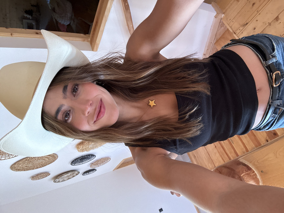 A woman with brown hair smiles at the camera while wearing a large, light-colored cowboy hat, a black ribbed tank top, and blue jeans with a black belt. She also wears a delicate necklace with a gold star pendant. The background includes a white ceiling adorned with decorative oval shapes and a wooden wall. The photograph seems to be taken from a slightly elevated angle, suggesting it could be a selfie.