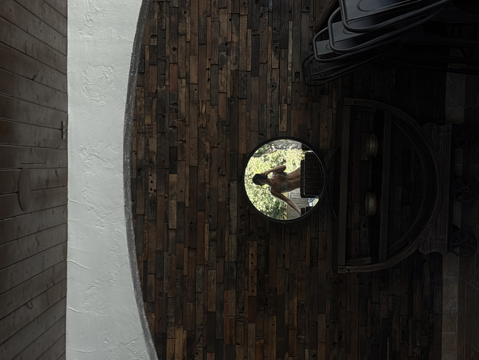 The image depicts an interior or semi-enclosed architectural space, located in San Antonio, United States. The upper portion of the frame shows a ceiling constructed from horizontal wooden planks, with a dark, circular object (possibly a speaker or recessed light) visible on its surface. Below the ceiling, a textured white stucco archway spans horizontally. The main wall beneath the archway is clad in irregular, dark-toned reclaimed wood panels, arranged horizontally. A circular mirror with a dark frame is mounted on this wooden wall, positioned slightly left of center. The mirror reflects a person, identified as female, dressed in a patterned two-piece swimsuit. The person's left arm is extended, holding a device consistent with a smartphone, indicating the capture of a mirror selfie. The background reflected in the mirror shows bright green foliage and outdoor elements, including what appears to be a wicker chair, suggesting an exterior or open-air setting immediately adjacent to the reflected individual. Below the mirror, a dark wooden console table with a distinctive half-barrel or wagon-wheel design rests on the floor, supported by visible wheels at its base. Two small, metallic, bowl-shaped objects are placed on the console's top surface. To the far right of the frame, a stack of at least three dark-colored chairs, possibly made of metal or plastic, is partially visible.