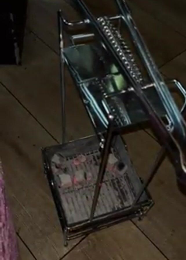 small, silver, portable barbecue grill sitting on a wooden floor. Inside the grill, there are several pieces of burning charcoal, glowing with red heat. The grill has a metal grate on top of the charcoal and a higher shelf-like structure with a slotted grilling area. There are also long, silver tongs laying across the upper portion of the grill. The camera is angled downwards, focusing on the coals and the grill's interior. Part of a purple, possibly velvet, couch is visible in the lower left corner of the frame.