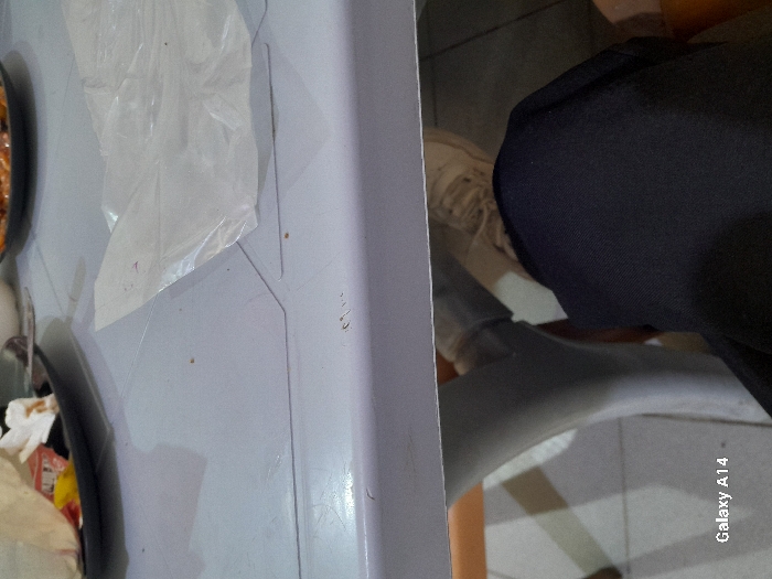 The image presents an indoor, close-up, downward perspective of a dining setting in Deir el-Balah, Palestinian Territory. A light gray plastic table, showing minor surface marks, occupies the central and upper portions of the frame. On the left side of the table, a dark-colored plate holds food remnants, including a piece of flatbread, crumpled white paper, and indistinct yellow food items. Behind this plate, parts of a white bowl and a metallic utensil are visible. Further back on the table, a dark dish containing food is partially discernible. On the right side of the table, a crumpled clear plastic bag rests. In the lower foreground, a person's lap, covered by dark fabric trousers, is visible. To the right, a light-colored shoe and a segment of bare skin are present. The floor beneath the table is tiled with a light-colored geometric pattern. A white table leg or chair support is visible on the lower left. The image includes a "Galaxy A14" watermark in the bottom left corner. No individuals are fully visible, and no active interactions are captured.