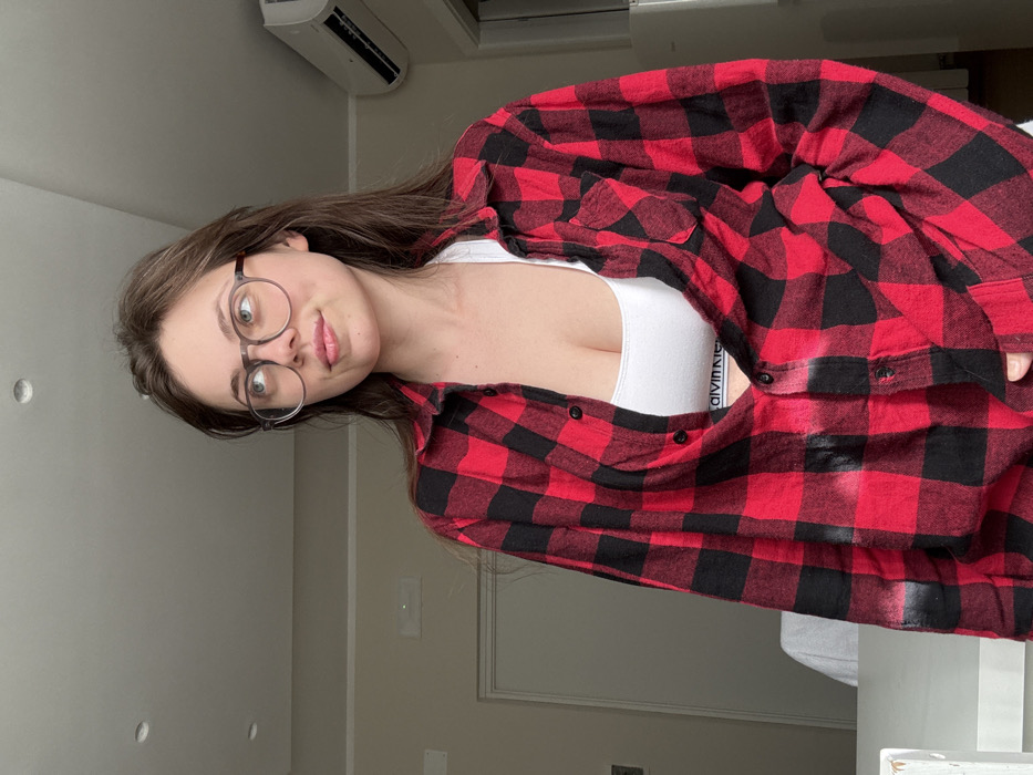 The scene depicts a young adult female positioned indoors within a residential or office setting in Scafati, Italy. The subject, with medium-length brown hair and wearing clear, circular-framed glasses, is oriented slightly right of center, looking towards the upper right of the frame with a subtle, neutral expression. She is dressed in an unbuttoned red and black buffalo plaid flannel shirt, revealing a white Calvin Klein sports bra or bralette underneath. Her left hand is partially visible at the bottom right. The background features light-colored walls; to the left, a white door and a white rectangular object (possibly a light switch or thermostat) are visible, along with a partial view of a white table or surface. To the right, a white wall-mounted air conditioning unit is present, and a section of a white appliance, possibly a refrigerator, is visible further right. The ceiling is light-colored and contains two recessed light fixtures. The lighting is even, suggesting ambient or natural light from an unseen source.