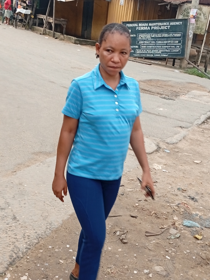 A woman in a blue striped polo shirt and blue pants walks on a road. Behind her is a sign for a "Federal Roads Maintenance Agency FERMA Project." The sign mentions construction of roads and drainage at Industrial Layout, Aba, Abia State. The contract number is FERMA/GM/VP/22-328, and the contractor is Base Construction Company Nig. Ltd. The sign also displays the phrase, "Think good roads, think FERMA." Trash is scattered on the ground to the right of the woman.