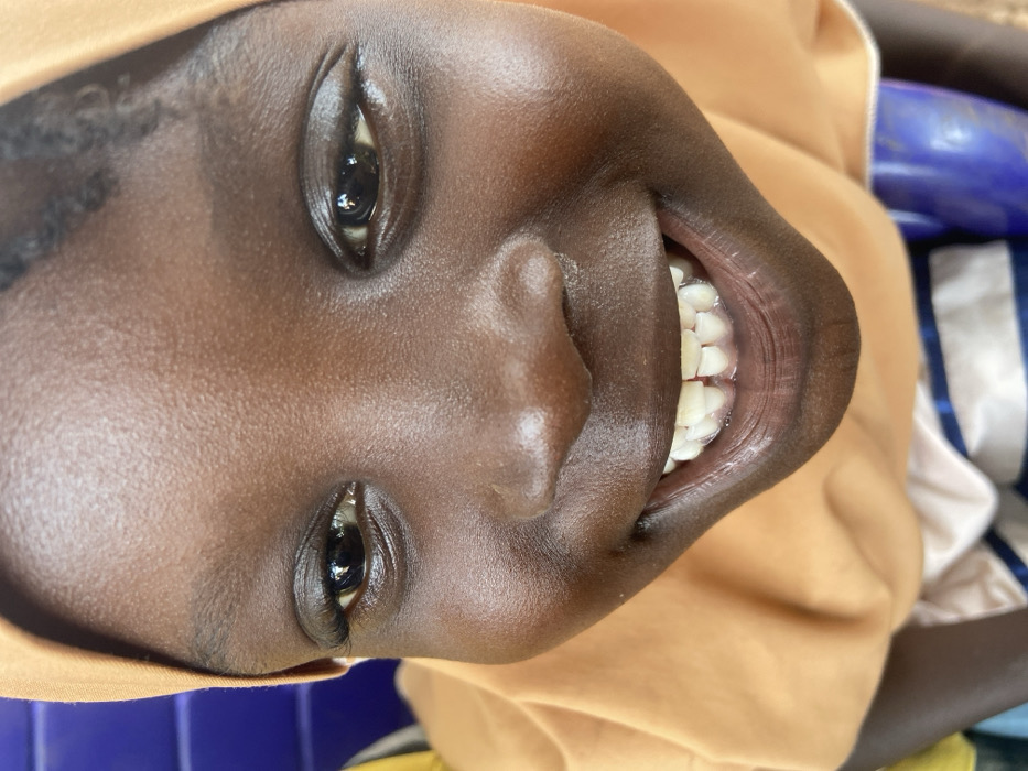 A close-up, high-angle portrait depicts a young individual in Ankpa, Nigeria. The subject, with dark skin, is wearing an orange head covering that frames the face, along with a white garment featuring blue stripes visible below the chin. The individual exhibits a wide, open-mouthed smile, revealing upper and lower white teeth, including a minor diastema between the upper central incisors. Dark brown eyes are open and directed towards the camera, reflecting an overhead light source. The background is out of focus, showing indistinct blue and yellow elements.