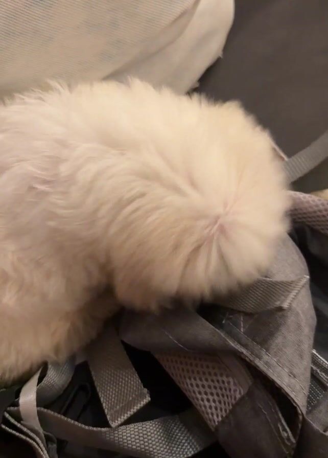 - "A small, fluffy, cream-colored dog sits on top of a grey backpack, pawing at the straps" by FM-6tOtI3, licensed under CC BY 4.0