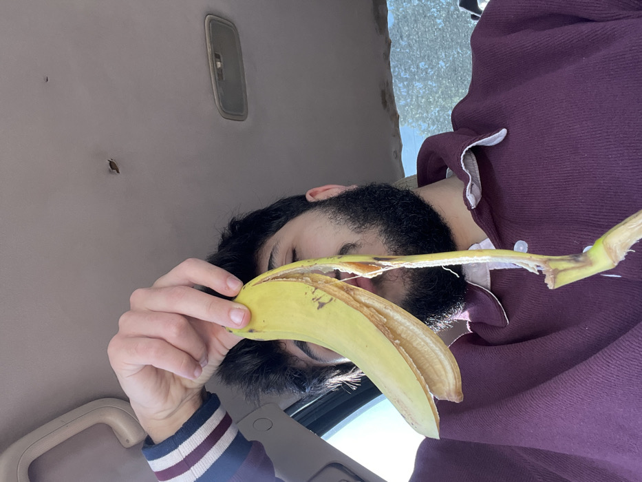 An adult male with dark hair and a beard, wearing a maroon collared long-sleeved shirt with striped cuffs on the left arm, is depicted inside a vehicle in Al-Qanawat Municipality, Syria. His left hand holds a yellow banana peel, obscuring the upper portion of his face, including his eyes. The banana peel is separated from the fruit, which is not visible. The vehicle's interior features a tan headliner, a light-colored grab handle on the upper left, and an overhead dome light on the upper right. A small, dark tear or hole is present in the headliner above the dome light. Blurred green foliage is visible through a side window in the right background. The scene is illuminated by natural light.