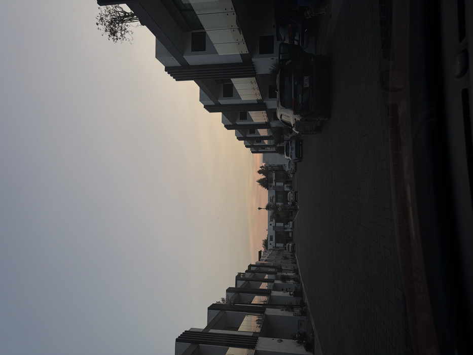 The image presents a street scene, rotated counter-clockwise. Matching modern buildings line both sides of a dark, paved road with cars parked alongside. The sky above transitions from grey to a warm orange near the horizon, suggesting twilight. The scene is partially obscured on the right side by a dark vertical structure, possibly a fence or the edge of a building.