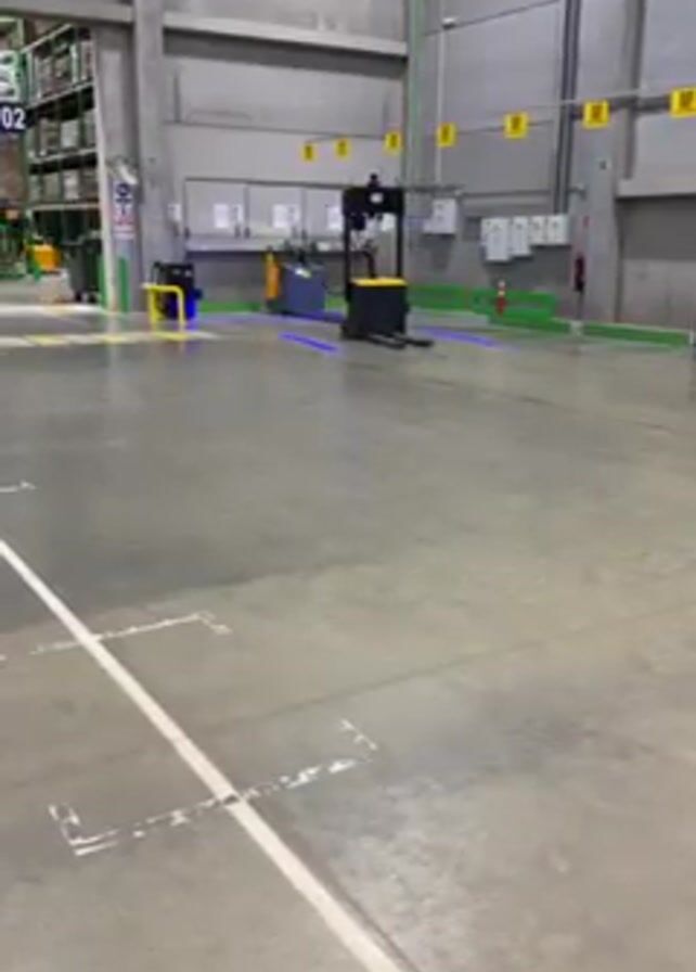 yellow forklift moving on a gray concrete floor of a large warehouse. The forklift is equipped with blue safety lights that project lines on the floor. The warehouse has tall concrete walls, marked lanes, and shelves stacked with items. A small, yellow safety barricade stands near the left edge of the frame. A wall behind the forklift has electrical boxes and QR codes.