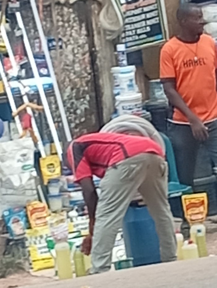 The image depicts an outdoor street scene in Maiburiji, Nigeria, appearing to be a market or roadside vendor area. In the immediate foreground, a male individual is bent over, facing away from the viewer, wearing a red short-sleeved shirt with black trim and light-colored trousers. He is positioned near several translucent plastic bottles containing a pale yellow liquid, arranged on the unpaved ground. Behind him, a large blue plastic barrel is visible. To the right, a second male individual stands in profile, looking towards the right. He wears an orange short-sleeved t-shirt with "HAMEL" printed in black on the chest, dark trousers, and a necklace with a pendant. The background features a densely packed vendor stall or shop. On the left, vertical fluorescent light tubes are mounted on a rack, alongside various packaged goods in bags (e.g., detergents, food items) in blue, yellow, and white packaging. On the right, a signboard with black text on a white background is visible, partially obscured. Below it are stacks of white plastic buckets and coils of white rope or hose. The overall environment suggests a commercial district with multiple goods for sale.