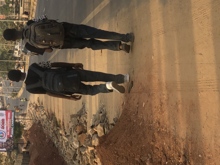 Two young men wearing backpacks walk on a road with rocky landscaping on the side. They both wear dark pants, one with brown shoes and the other with white shoes. A political poster can be seen in the distance on the left, alongside a busy street with vehicles and people. The road they walk on is dusty and shows tire tracks. The lighting suggests it is either early morning or late afternoon.