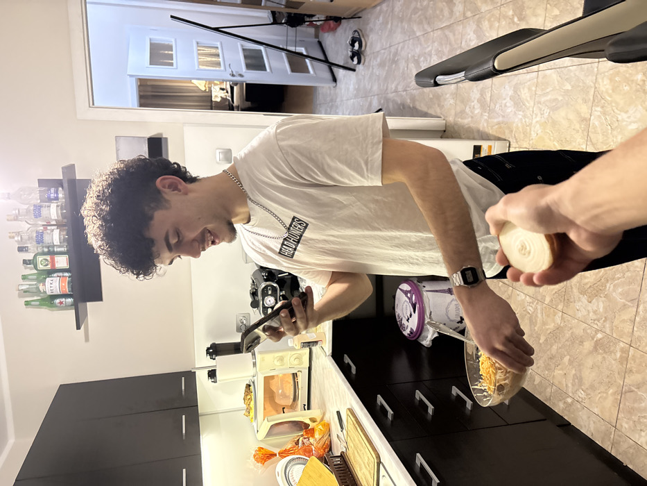 The image depicts an indoor kitchen scene, the specific location within Sofia, Bulgaria, is indeterminable from the visual evidence. A young adult male, with curly dark hair and a light beard, stands in the center-left, facing slightly right and smiling while looking at a black smartphone held in his left hand. He wears a white t-shirt with "HEAD HUNTERS" printed on it, a silver chain, dark pants, and a silver digital wristwatch on his left wrist. His right hand holds a clear glass bowl containing a mix of food, including shredded elements and possibly cheese, with a spoon inside. In the immediate foreground, a left hand extends into the frame from the right, holding a halved white onion with the cut side facing the primary subject. The kitchen features dark brown/black overhead cabinets with under-cabinet lighting on the left, above a light-colored countertop. On the countertop, a white microwave oven with a plate inside, a black coffee machine, a wooden cutting board, a knife, and various other kitchen items are visible. A black floating shelf above the countertop holds several bottles of alcohol. A white plastic trash can with a purple Eiffel Tower design lid is positioned between the primary subject and the counter. The floor is covered in light-colored tiles. To the right, a partially open white door with glass panels leads to an adjacent room, where a table lamp is discernible. A black stand or tripod is near the doorway, and a pair of dark shoes are on the floor. Part of a black and beige office-style chair is visible in the lower right foreground.