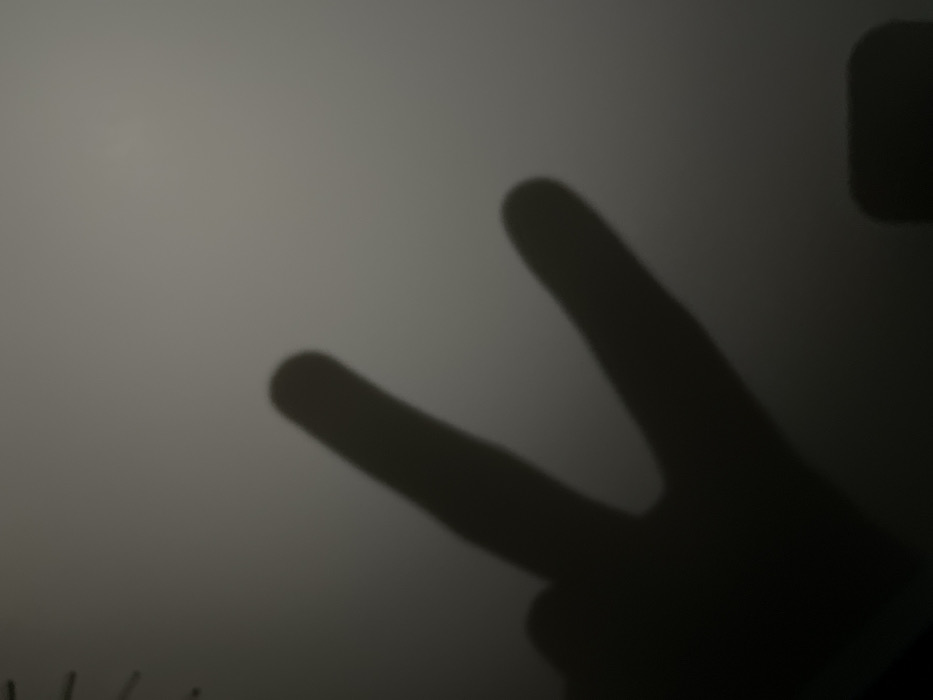 A stark, shadowy image depicts a hand making a "peace" or "victory" sign, casting a stark silhouette against a grayish background. The fingers are splayed in a V-shape, with only the index and middle fingers extended. A blurred, rectangular shape is visible in the upper right corner, possibly the back of the hand. The overall scene is obscured with shadow, reducing visibility.