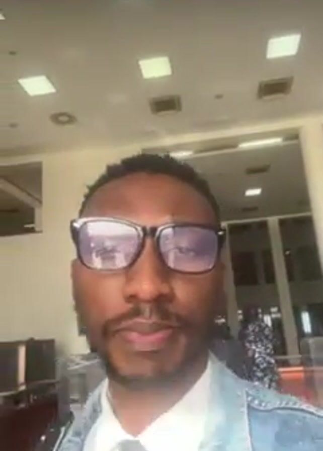 A man with brown skin, wearing glasses, a light blue denim jacket, and a dark tie, is holding a smartphone and looking at the camera. He appears to be inside a building with a high ceiling, square lighting fixtures, and people in the background. The camera angle suggests he is taking a selfie or recording a video.
