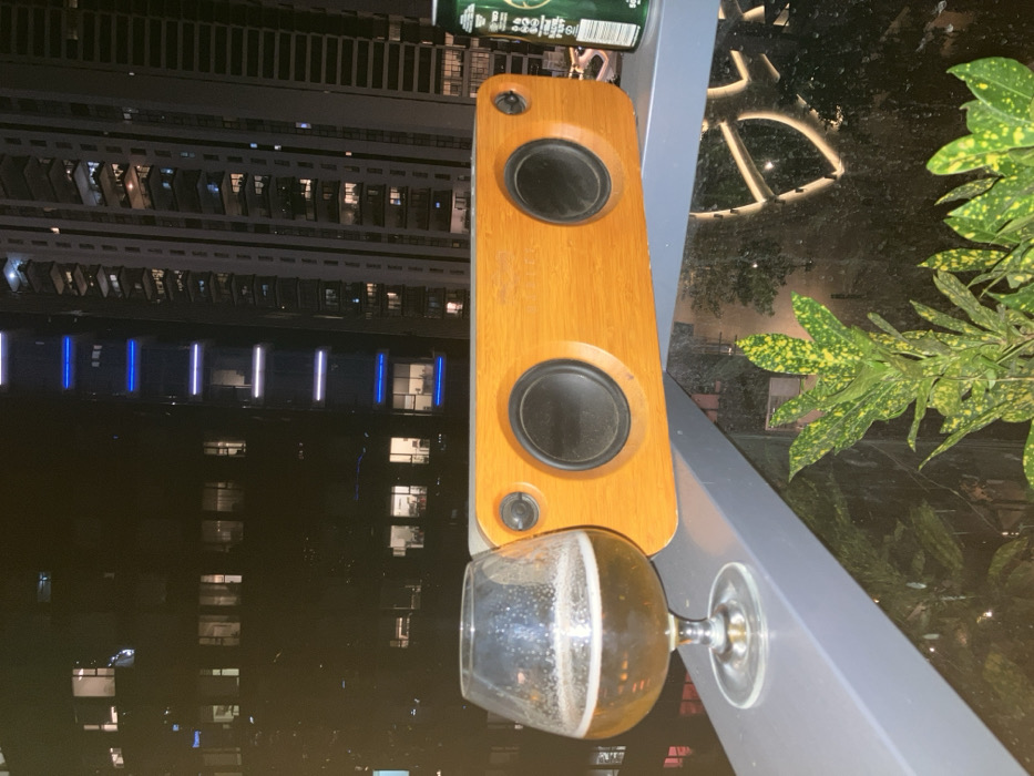 The scene depicts a night-time urban environment, viewed from an elevated balcony in Givatayim, Israel. In the immediate foreground, a stemmed snifter glass containing a half-full amber liquid with a foam head rests on a dark gray railing. To its right, a horizontal wooden-cased portable speaker with two prominent black speaker cones and two smaller circular controls is also positioned on the railing. Further right and slightly behind the speaker, a green beverage can is visible. Below the railing, a green plant with yellow-speckled leaves occupies the lower mid-ground. The background reveals multiple illuminated high-rise buildings; one features vertical strips of alternating blue and white horizontal exterior lights, while another displays numerous illuminated windows and balconies. Faint ground-level lighting and a decorative circular light pattern are visible below the structures. No individuals are present in the image.