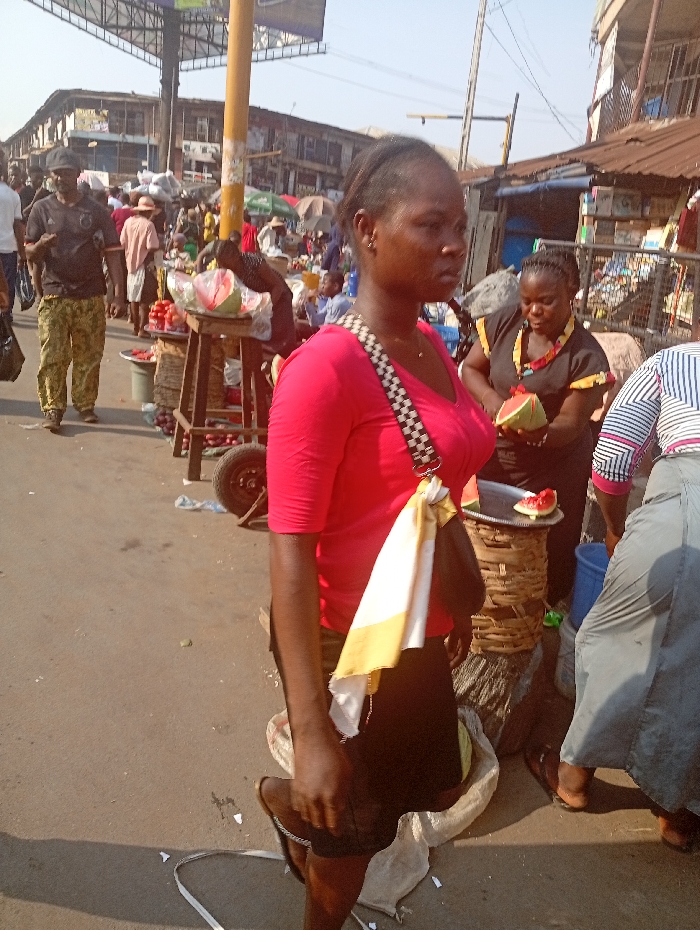 A woman in a red shirt and black skirt walks through a bustling market. She has a handbag with a checkered strap and a white and yellow cloth tied to it. Behind her, a woman cuts a watermelon. In the background, vendors display fruits and other items. A man wearing a hat and patterned pants walks in the opposite direction. Various buildings and structures surround the open-air market scene.