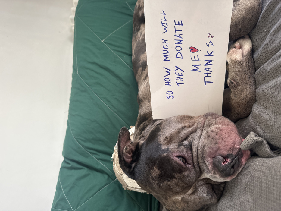 The image displays a brindle-patterned dog, appearing to be a bully breed, lying on its left side indoors. Its head rests on a gray textured fabric, likely a blanket or cushion. The dog's left eye is partially open, looking forward, while its snout and a pinkish nose are prominent. A white rectangular piece of paper is positioned across the dog's right shoulder and chest. Hand-written text in blue ink on the paper reads: "SO HOW MUCH WILL THEY DONATE ME❤️ THANKS💖💖". In the background, a dark green quilted fabric, consistent with a comforter or upholstered furniture, is visible, topped by a plain white wall. There is no discernible visual information within the image to identify its location as the city of Stains, France, or any specific external environment.