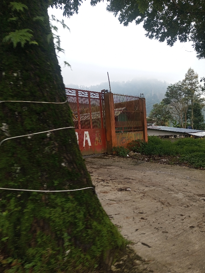 A moss-covered tree trunk dominates the foreground, bisected by two white wires. An orange gate with metal bars stands further back, partially obscured by the tree. Red lettering is visible on the gate's lower section. Beyond the gate, hints of a foggy landscape suggest a mountainous region. Vegetation grows alongside a concrete path leading towards the gate. A building with a slanted roof is visible behind the gate.